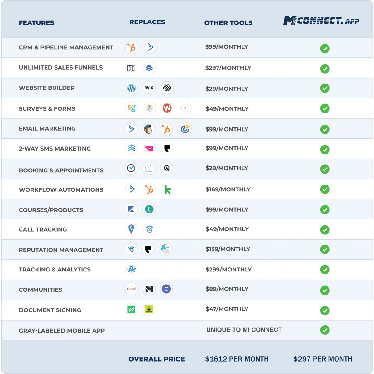 Instead of having to subscribe to multiple services, you can use Mi Connect for it all. Our platform includes a robust yet easy to use CRM, Sales Funnel, and Pipeline Management system. Easily execute email and SMS campaigns, set appointments and automate workflows. Migrate your website to Mi Connect or simply use our unlimited sites, landing pages, and forms for specific campaigns. But best of all, you get unlimited users - no more 'per seat' pricing!